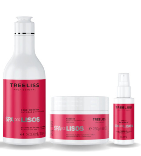Kit Spa Dos Lisos (Rojo) by Treeliss is a complete hair care system formulated for hair that needs smoothing and frizz control. This kit includes professional products that work together to realign hair fibers, deeply nourish and repair damaged hair, and improve overall hair health. Ideal for straight or chemically straightened hair, it helps maintain sleek, smooth, and shiny strands while strengthening hair from root to tip. Perfect for salon use or at-home treatments for long-lasting smoothness and manageability.